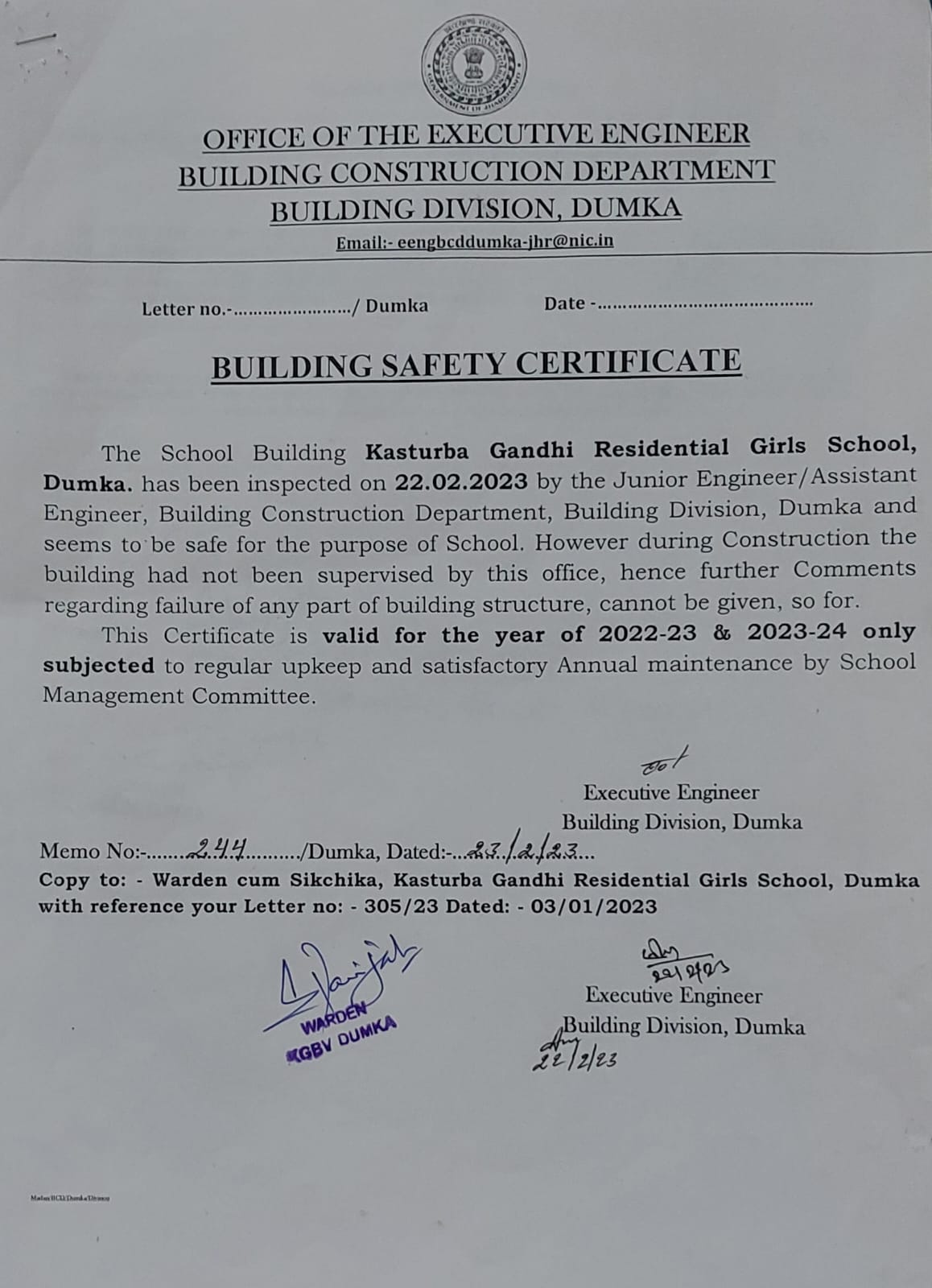 | 6 | COPY OF VALID BUILDING SAFETY CERTIFICATE AS PER THE NATIONAL BUILDING CODE | View Document |